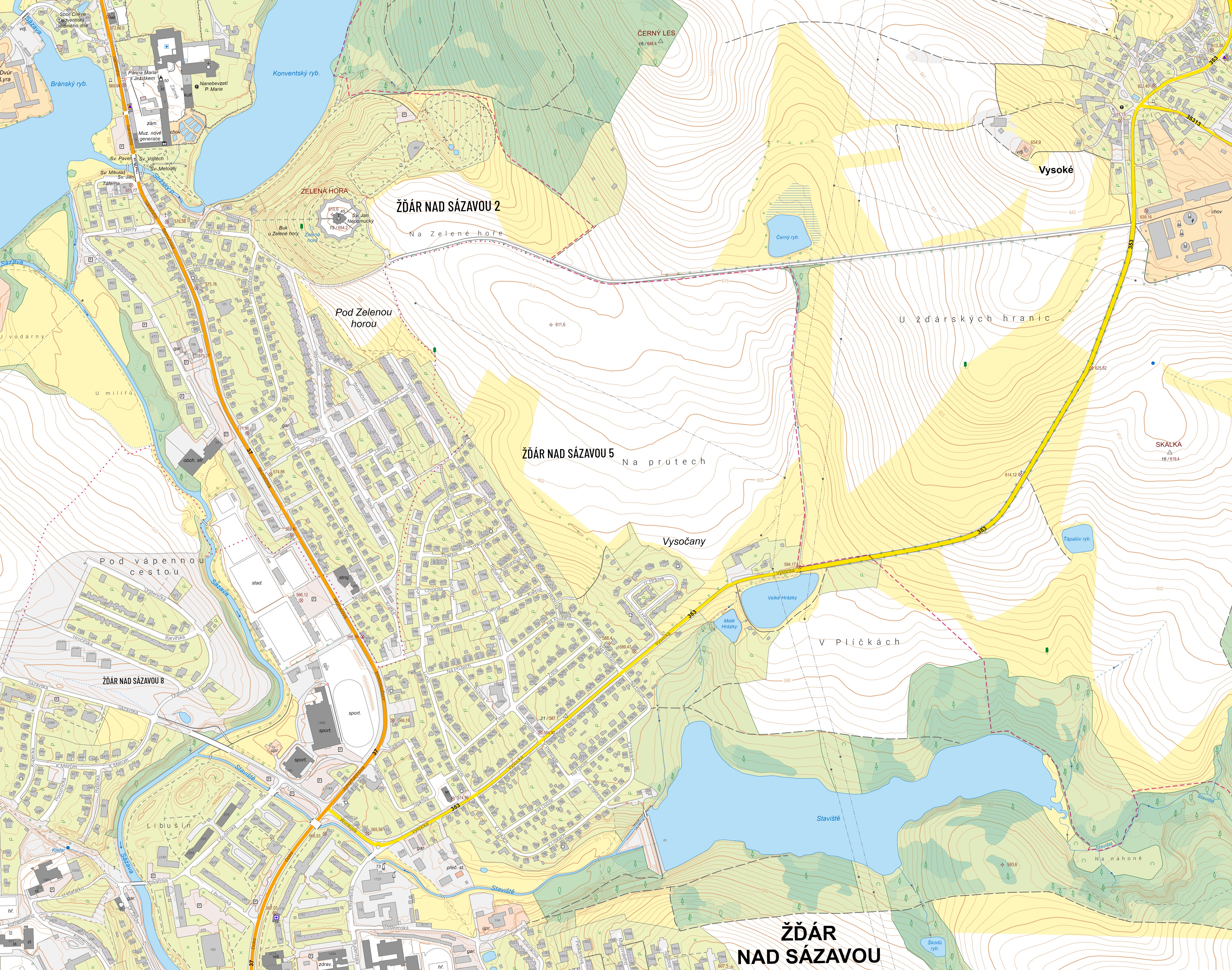 | Popis produktu | Základní topografická mapa České republiky 1 : 5 000 v rovinném souřadnicovém systému Evropského terestrického referenčního systému 1989 v univerzálním transverzálním Mercatorově zobrazení poledníkových zón (ETRS89-TMzn), dále v textu označovaná jako ZTM 5/ETRS89 od 1. 1. 2026 rozšiřuje řadu státního mapového díla o variantu ZTM 5 v rovinném souřadnicovém systému ETRS89-TMzn, jedná se tak o alternativu k ZTM 5 v národním souřadnicovém systému S-JTSK. Obsahově se ZTM 5/ETRS89 neliší od primární ZTM 5/S-JTSK. ZTM 5/ETRS89 zobrazuje celé území České republiky v souvislém kladu mapových listů, území České republiky je zobrazeno na 18 287 mapových listech. Sekční čáry kladu (vnitřní rámy) mapových listů ZTM/ETRS89 tvoří obrazy poledníků a rovnoběžek ve stanoveném rozestupu závislém na měřítku mapy. Mapový list ZTM 5/ETRS89 tak zabírá plochu 1´ × 2´ (zeměpisná šířka × zeměpisná délka). Do rozměru nejsou započítány doprovodné prvky uváděné na tiskové variantě mapového listu (tj. např. stykový pás a rámové a mimorámové údaje). Rozměry tištěné verze mapy včetně všech rámových a mimorámových údajů jsou 480 mm × 770 mm. Mapové listy ZTM 5/ETRS89 jsou označeny nomenklaturou, která má alfanumerický charakter a vychází z označení Mezinárodní mapy světa 1 : 1 000 000 (pro ČR NM-33 a NM-34) o rozměrech 6 stupňů zeměpisné délky a 4 stupně zeměpisné šířky. Další znaky upřesňují polohu mapového listu daného měřítka v rámci mapového listu menšího měřítka, z něhož je odvozen. Mapové listy jsou navíc doplněny o název mapového listu, který je zpravidla shodný se jménem největšího sídla vyskytujícího se na daném mapovém listu, v případě ZTM 5/ETRS89, ZTM 10/ETRS89 a ZTM 25/ETRS89 se jedná o název příslušné ZTM 50/ETRS89. Nenachází-li se na mapovém listu žádné sídlo, použije se jiné jedinečné geografické jméno (vrchol, vodní tok, pozemková trať) z daného mapového listu. Mapové listy ZTM 5/ETRS89 vznikají rozdělením mapového listu ZTM 10/ETRS89 2 řadami po 1 minutě zeměpisné šířky a 2 sloupci po 2 minutách zeměpisné délky na 4 mapové listy, které se číslují v rámci mapového listu ZTM 10/ETRS89 průběžně v řadách od severozápadního mapového listu čísly 1, 2, 3, 4. Označení mapového listu je např. Žďár nad Sázavou NM-33-08-6-B-20-1. ZTM 5/ETRS89 obsahuje polohopis, výškopis a popis. Předmětem polohopisu jsou sídla a jednotlivé objekty, komunikace, vodstvo, hranice správních jednotek a katastrálních území, hranice chráněných území, body polohového bodového pole, porost a povrch půdy. Předmětem výškopisu je terénní reliéf zobrazený vrstevnicemi a terénními stupni. Popis mapy sestává z druhového označení objektů, standardizovaného geografického názvosloví (včetně názvů ulic), kót vrstevnic, výškových kót a čísel popisných. Znázorněny jsou pouze předměty obsahu mapy vyskytující se na území České republiky. Nezbytná generalizace a posuny jednotlivých objektů jsou využívány velice omezeně. Mapa tak poskytuje podrobné informace o vymezeném území s vysokou polohovou přesností a se zachováním tvaru i rozměru zobrazených plošných topografických objektů jako ve zdrojových databázích. Obsahem tištěných mapových listů je i kilometrová síť ETRS89-TMzn a S-JTSK a zeměpisná síť ETRS89, mapový rám s rámovými údaji (např. směrové údaje vybraných komunikací, názvy spůlných sídel, popis sousedících států, souřadnice) a mimorámové údaje (např. vysvětlivky, tirážní údaje, grafické, číselné a sklonové měřítko, interpolační měřítko zeměpisné sítě souřadnicového systému ETRS89, grafické zobrazení mapy v kladu mapových listů, vyjádření poledníkové konvergence a magnetické deklinace, grafická vyjádření přehledu správních a katastrálních hranic a hranic chráněných území ad.). | |
